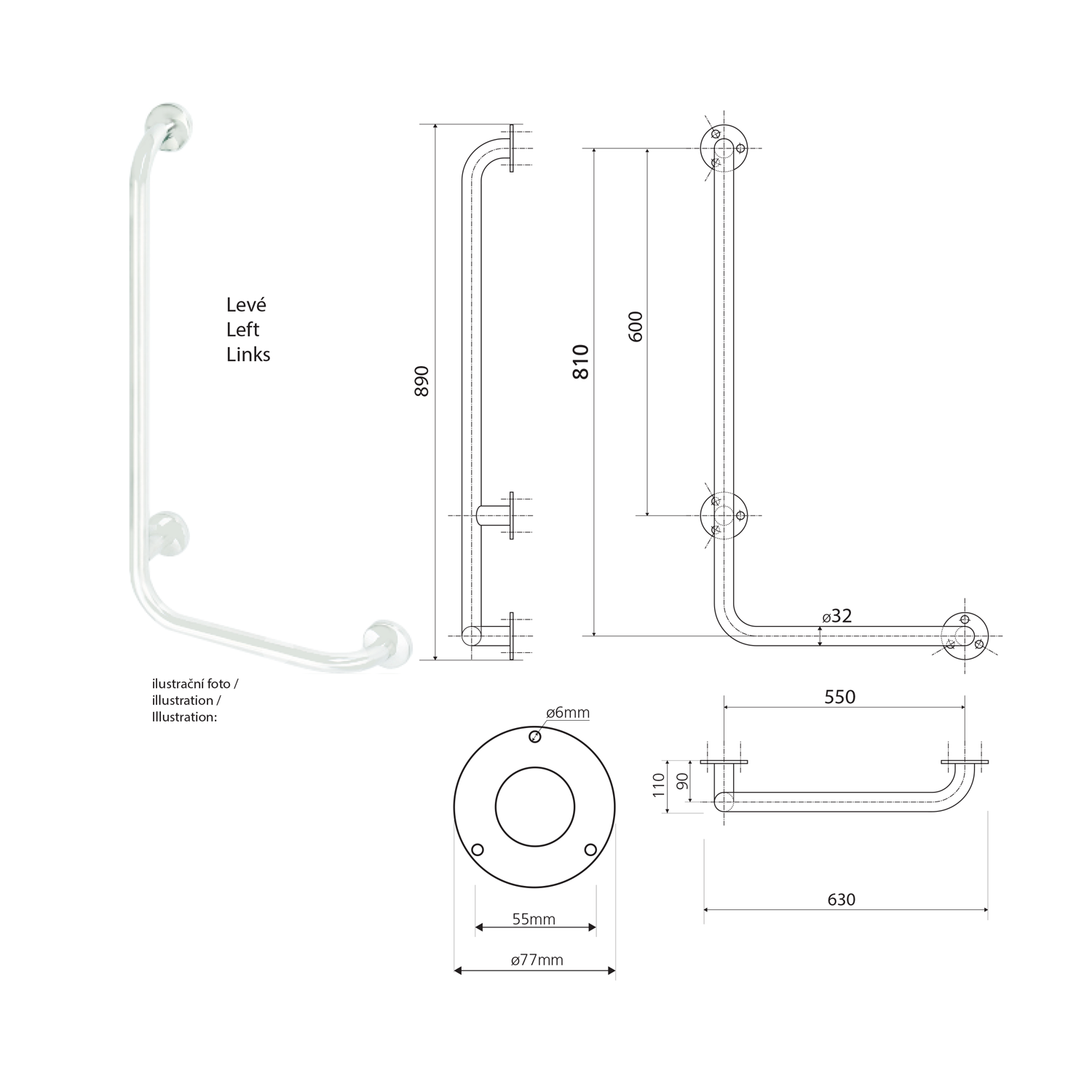 K uchycení jsou dodávány nerez šrouby podle DIN 95, 6×60 mm s hmoždinkami z plastu pro montáž do plných cihel a betonu.