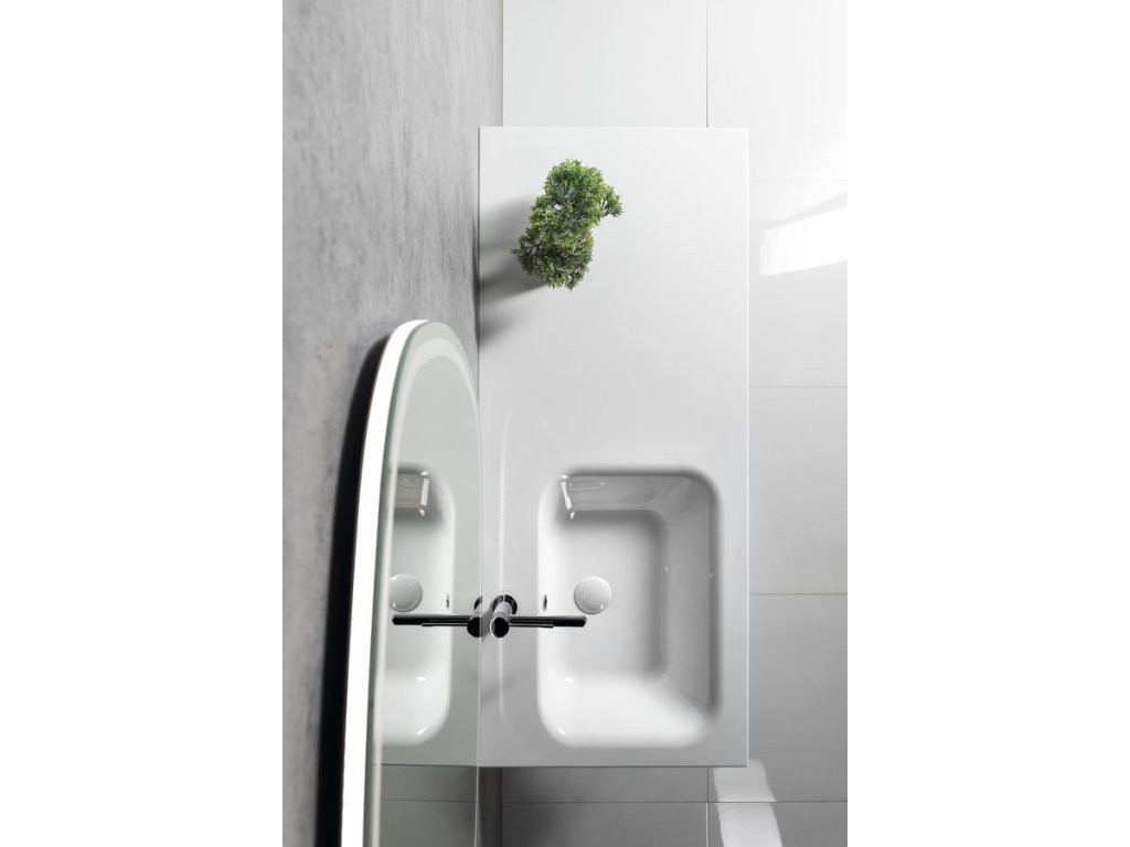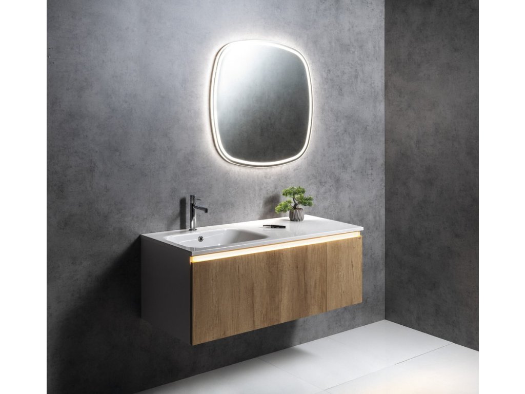 Uvnitř skříňky je nad zásuvkou praktická police na drobnosti každodenní potřeby. Pod hranu umyvadla lze instalovat tlumené LED osvětlení, které pro jeho nízkou spotřebu (1W) není nutné vypínat.