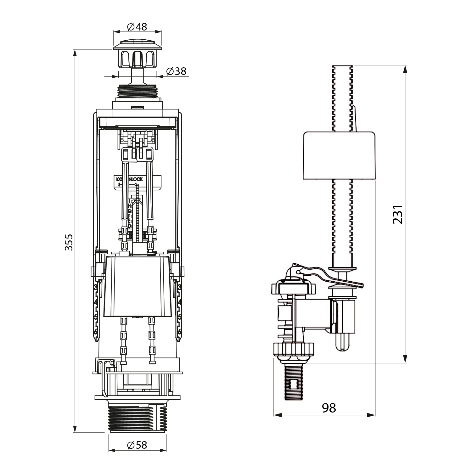 Kombinace úsporného splachovacího ventilu s dvoutlačítkem a ventilu se spodním napouštěním
