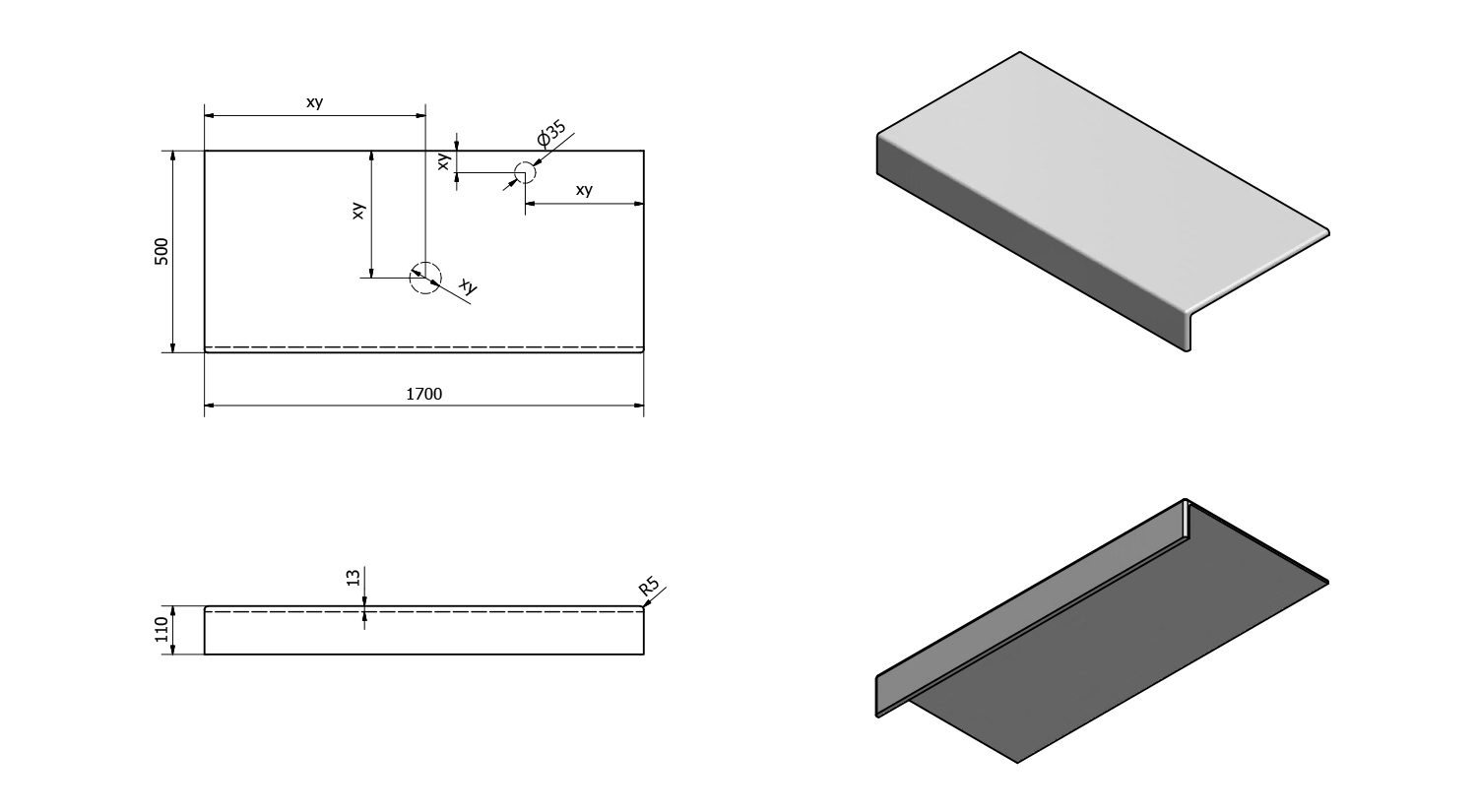 - Možnost dodání s otvory pro baterii a odpad dle výkresu (lze vrtat i v místě instalace)