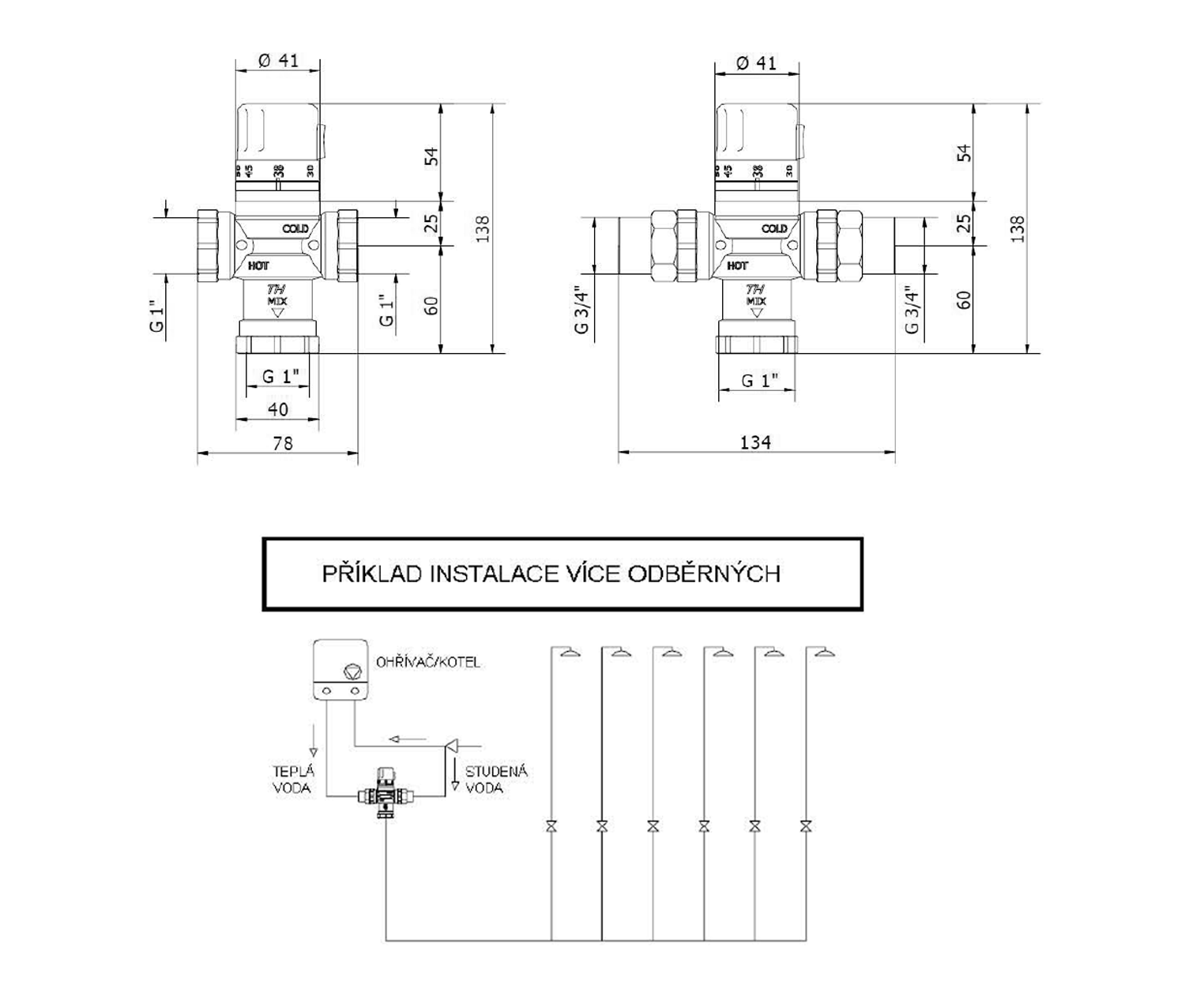 - Vstup teplá: F3/4" se zpětnou klapkou