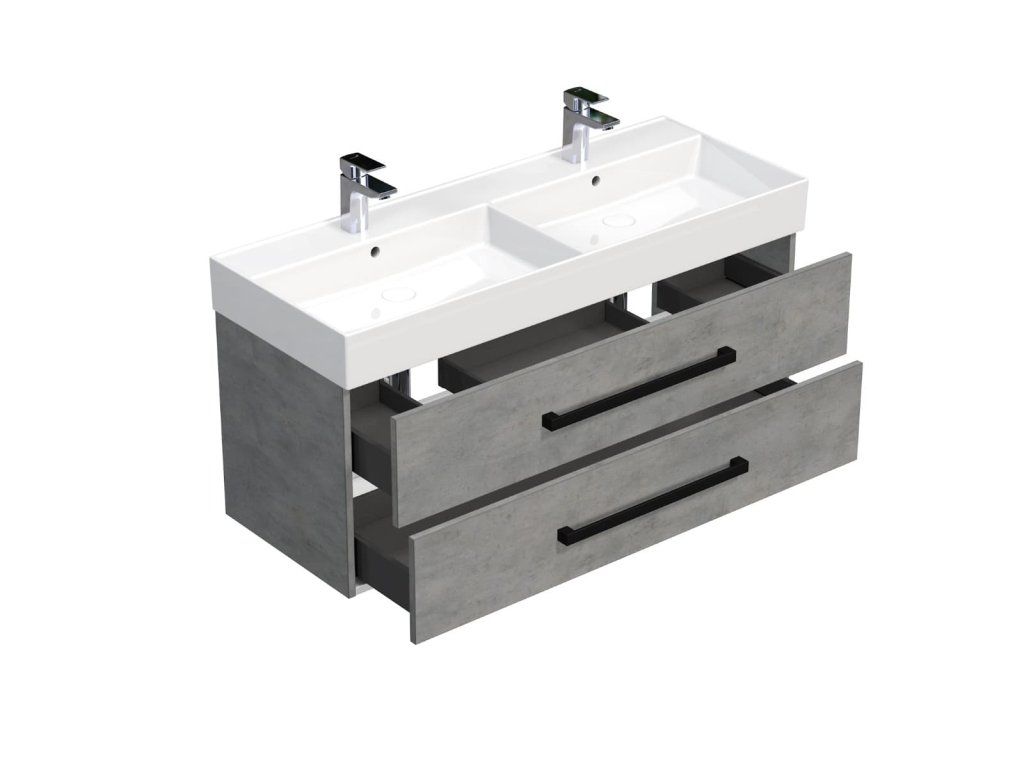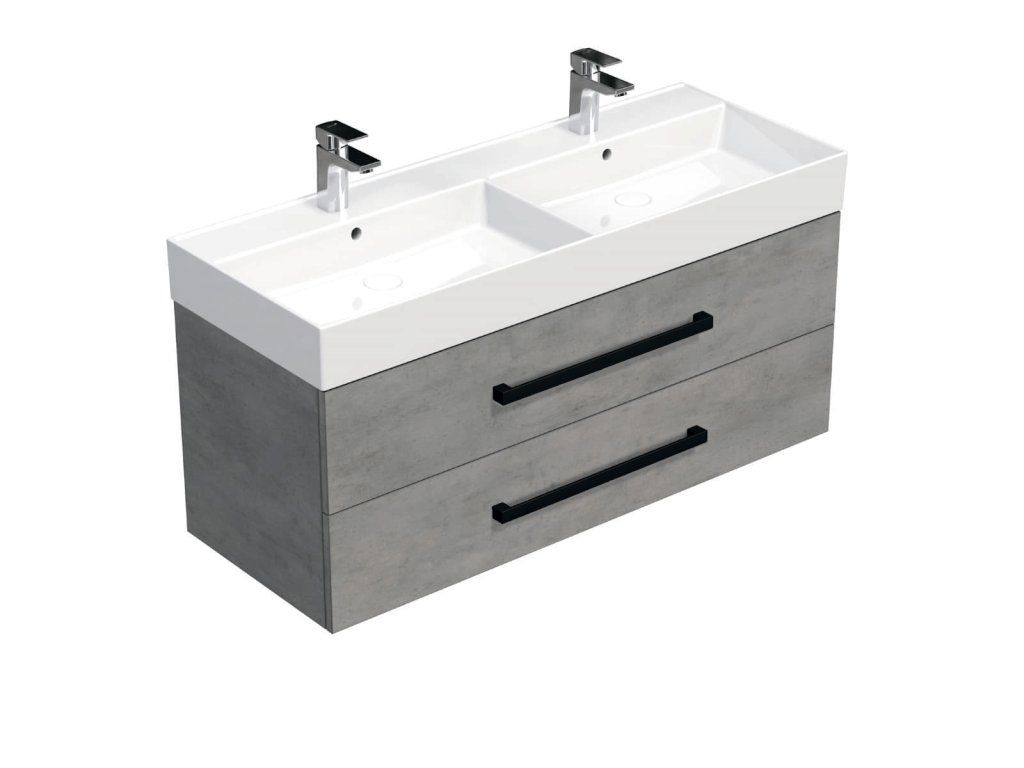 Závěsná koupelnová skříňka s černou úchytkou a keramickým umyvadlem v imitaci betonu s matným povrchem o rozměru 120x47,5x46 cm. Povrch v provedení lamino. ZÁRUKA 5 LET, dostupnost náhradních dílů 10 LET.Doplňkové parametry