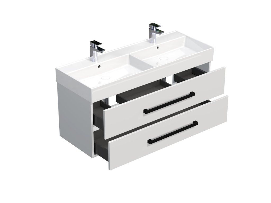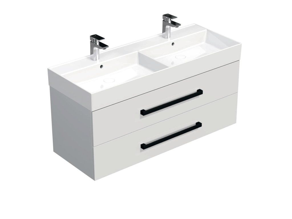Závěsná koupelnová skříňka s černou úchytkou a keramickým umyvadlem v bílé barvě v lesklém provedení o rozměru 120x47,5x46 cm. Povrch v provedení lamino. ZÁRUKA 5 LET, dostupnost náhradních dílů 10 LET.Doplňkové parametry