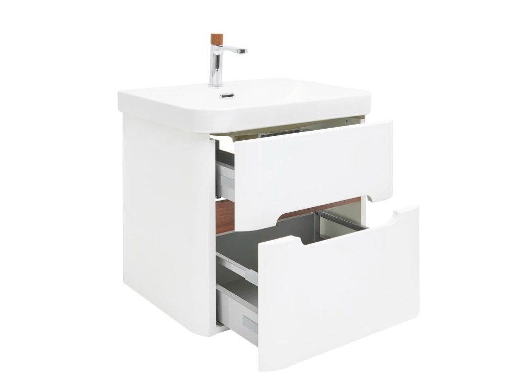 Závěsná koupelnová skříňka s keramickým umyvadlem v bílém matném provedení s matným povrchem o rozměru 57,5x53x45 cm. Povrch v provedení lamino. ZÁRUKA 5 LET, dostupnost náhradních dílů 10 LET.Doplňkové parametry