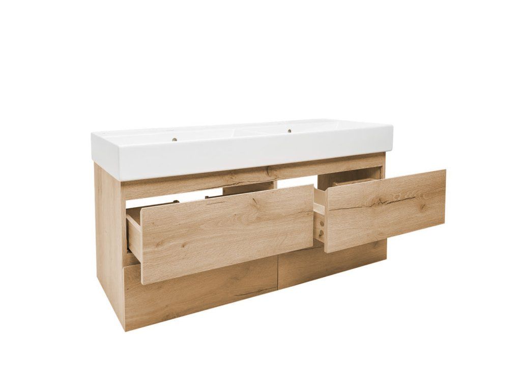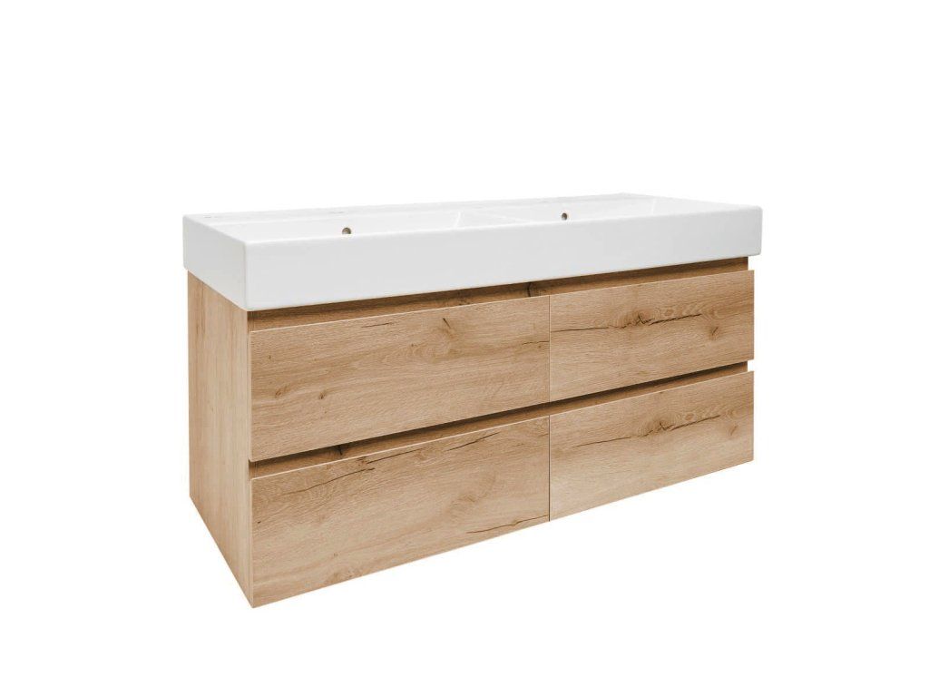 Závěsná koupelnová skříňka s keramickým umyvadlem v dekoru dub v matném provedení o rozměru 119x50x45 cm. Povrch v provedení lamino. ZÁRUKA 5 LET, dostupnost náhradních dílů 10 LET.Doplňkové parametry