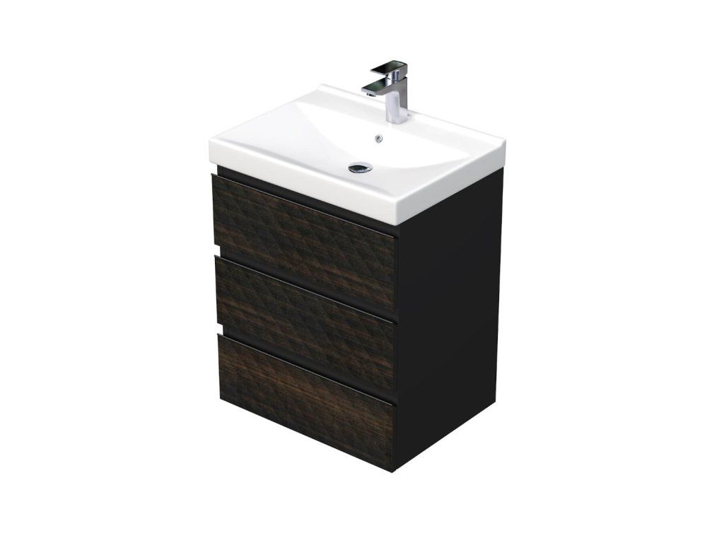 Závěsná koupelnová skříňka s keramickým umyvadlem v hnědé barvě s matným povrchem o rozměru 60x71x46 cm. Povrch v provedení lamino. S plnovýsuvem a dotahem. ZÁRUKA 5 LET, dostupnost náhradních dílů 10 LET.Doplňkové parametry