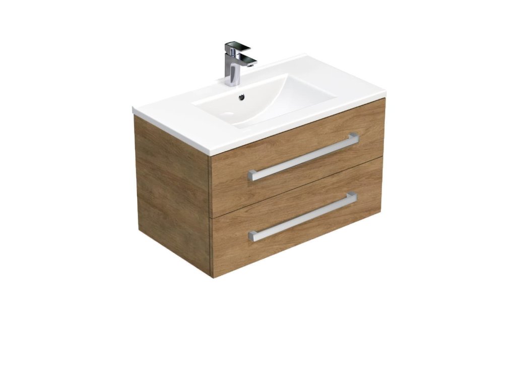 Závěsná koupelnová skříňka s keramickým umyvadlem v provedení dub hickory o rozměru 80x47,5x46 cm. Povrch v provedení lamino. ZÁRUKA 5 LET, dostupnost náhradních dílů 10 LET.Doplňkové parametry