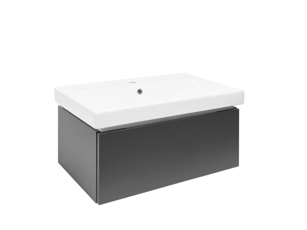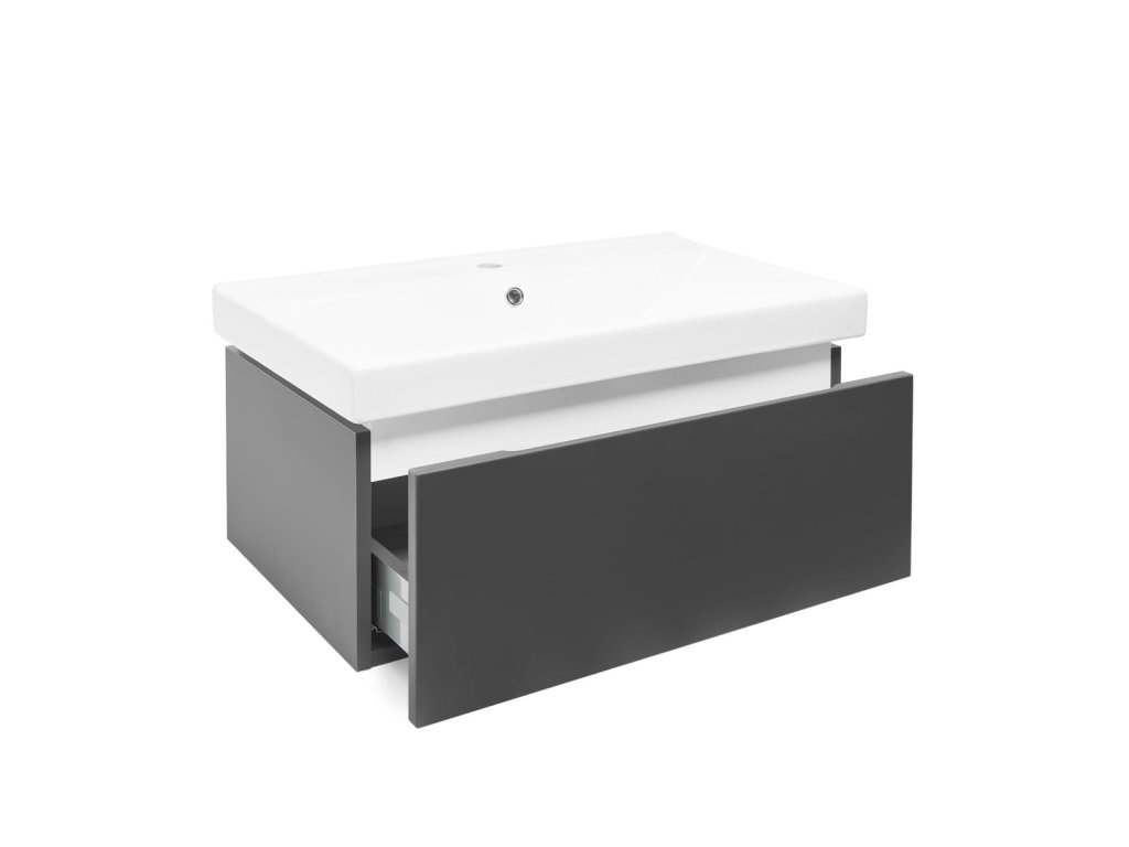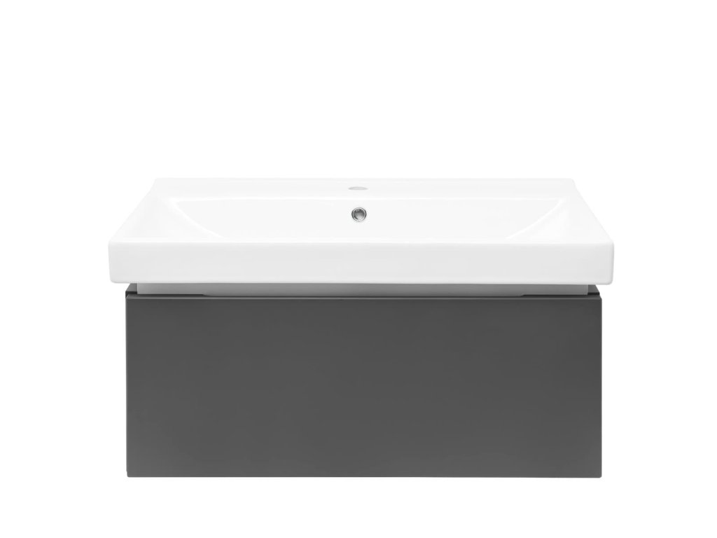 Závěsná koupelnová skříňka s keramickým umyvadlem v antracitové barvě s matným povrchem o rozměru 80x30x46 cm. Povrch v provedení lamino. ZÁRUKA 5 LET, dostupnost náhradních dílů 10 LET.Doplňkové parametry