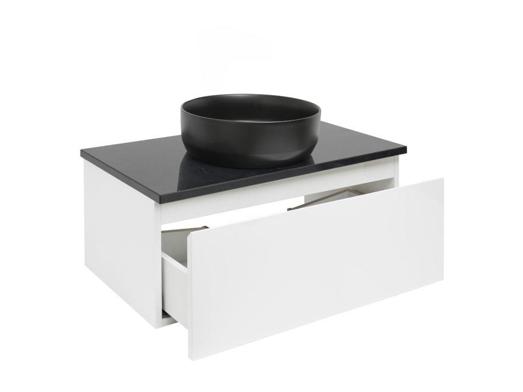 Závěsná koupelnová skříňka v bílé barvě s lesklým povrchem o rozměru 79x30x45 cm. Povrch v provedení lamino. Krycí deska v černé barvě ZÁRUKA 5 LET, dostupnost náhradních dílů 10 LET.Doplňkové parametry