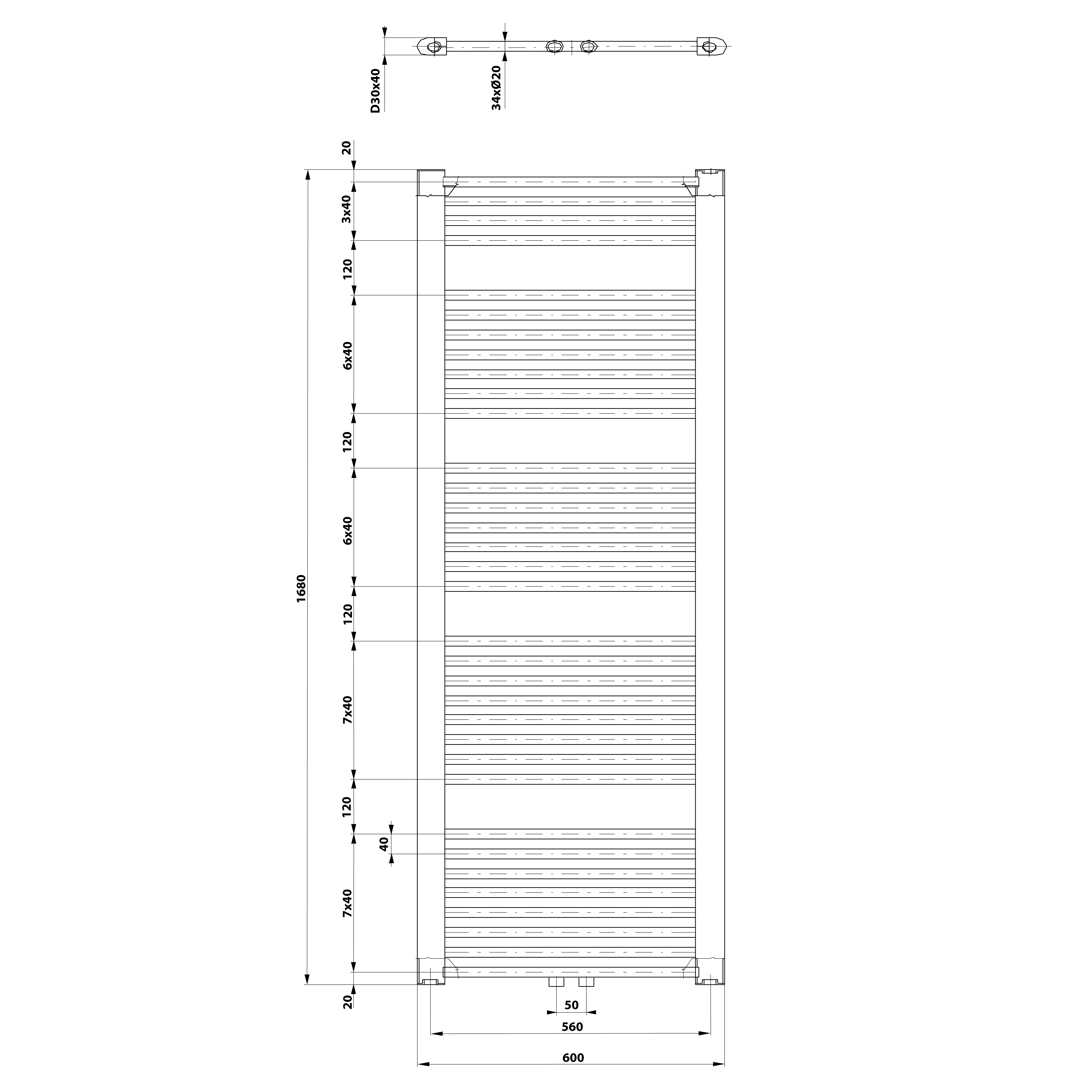 Tradičně tvarované otopné těleso z ocelových trubek v bílém provedení s rovnými vodorovnými profily, středové připojení s roztečí 50 mm.