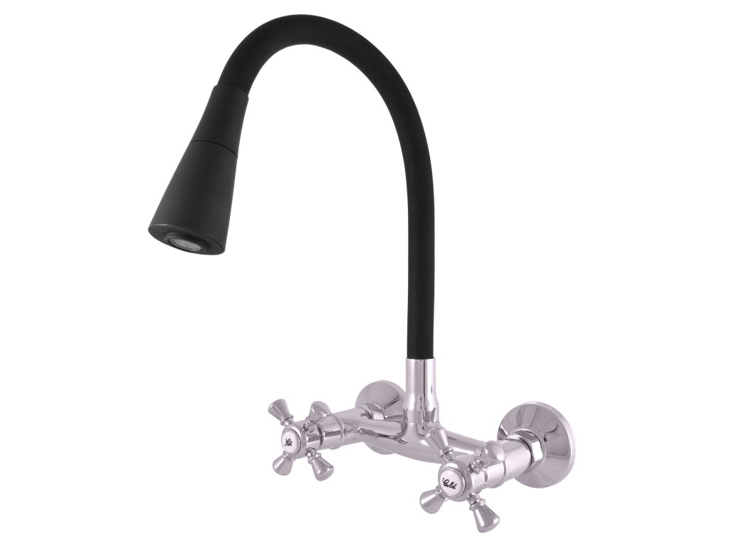 Vodovodní baterie dřezová nástěnná s flexibilním otočným ramínkem se sprchou.