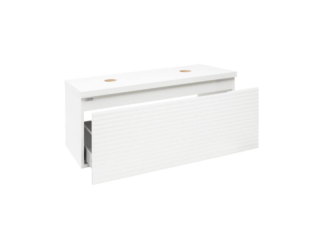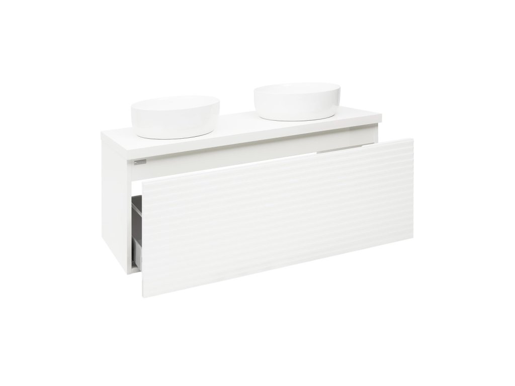 Závěsná koupelnová skříňka pod umyvadlo v bílé lesklé barvě. S lesklým povrchem o rozměru 118x43x44,8 cm. Povrch v provedení lamino.Dodatočné parametre