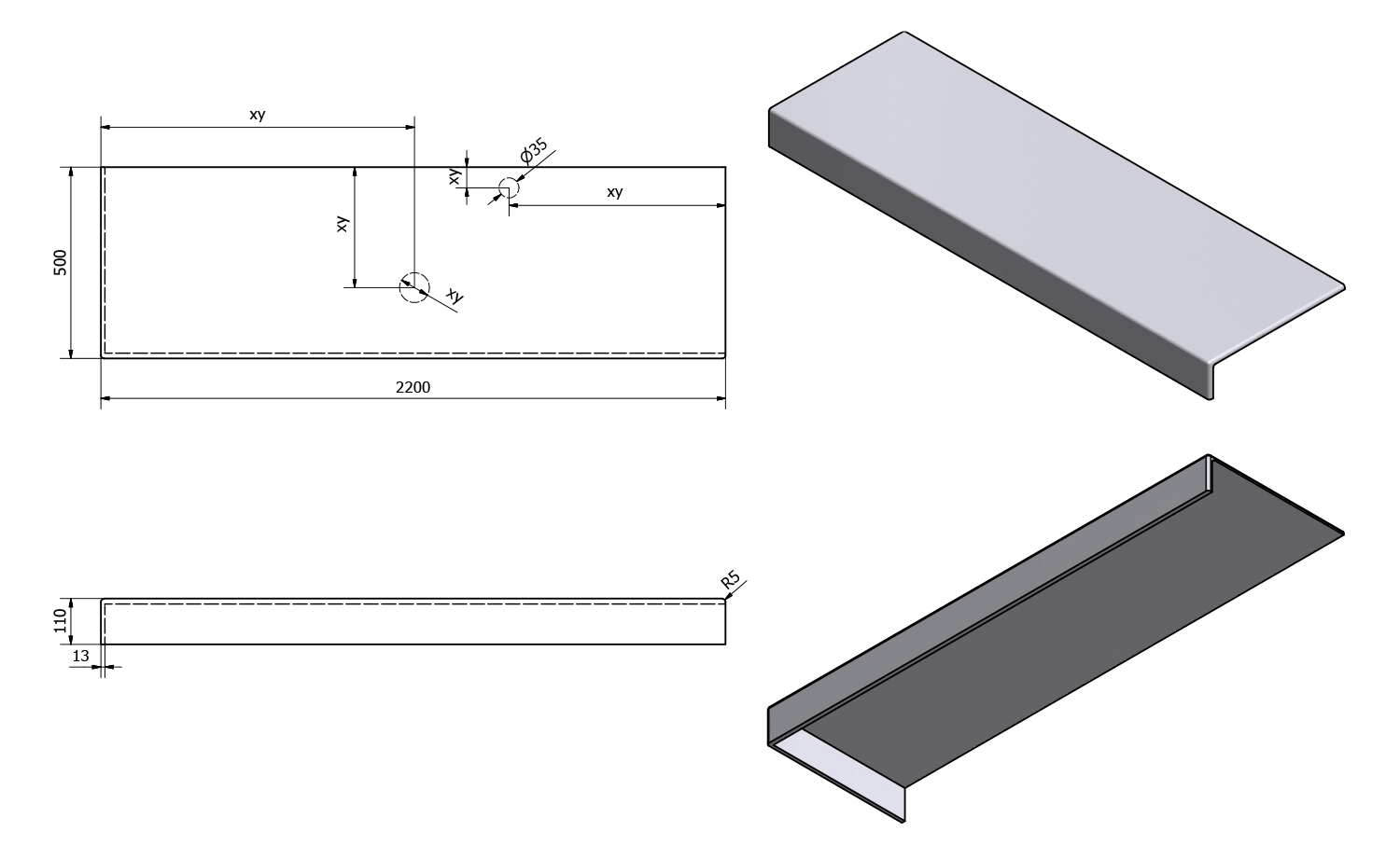 - Možnost dodání s otvory pro baterii a odpad dle výkresu (lze vrtat i v místě instalace)