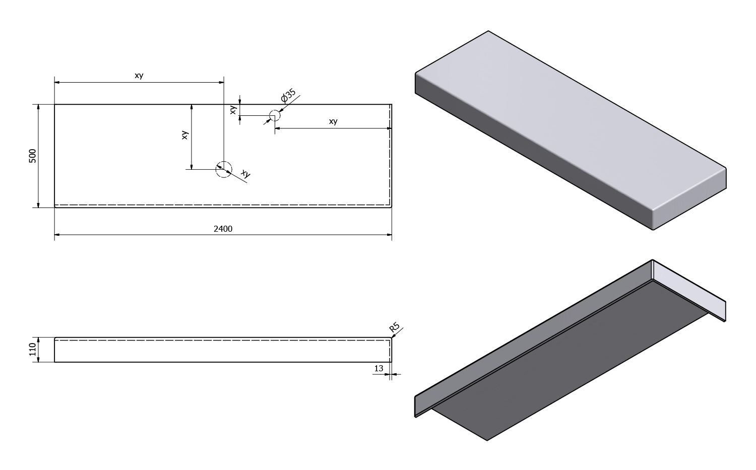 - Možnost dodání s otvory pro baterii a odpad dle výkresu (lze vrtat i v místě instalace)