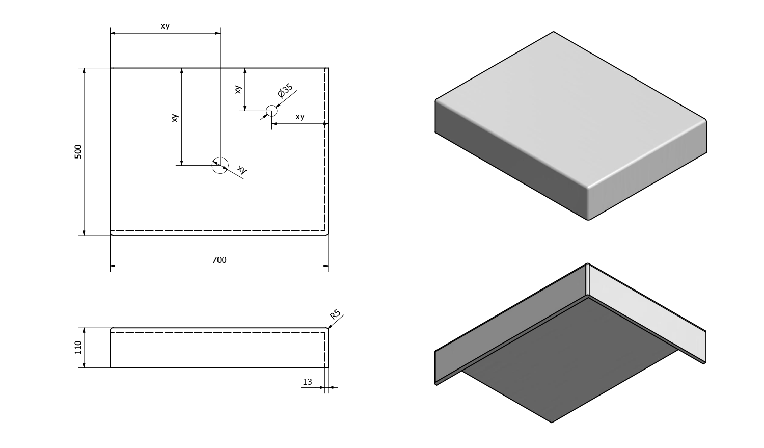 - Možnost dodání s otvory pro baterii a odpad dle výkresu (lze vrtat i v místě instalace)