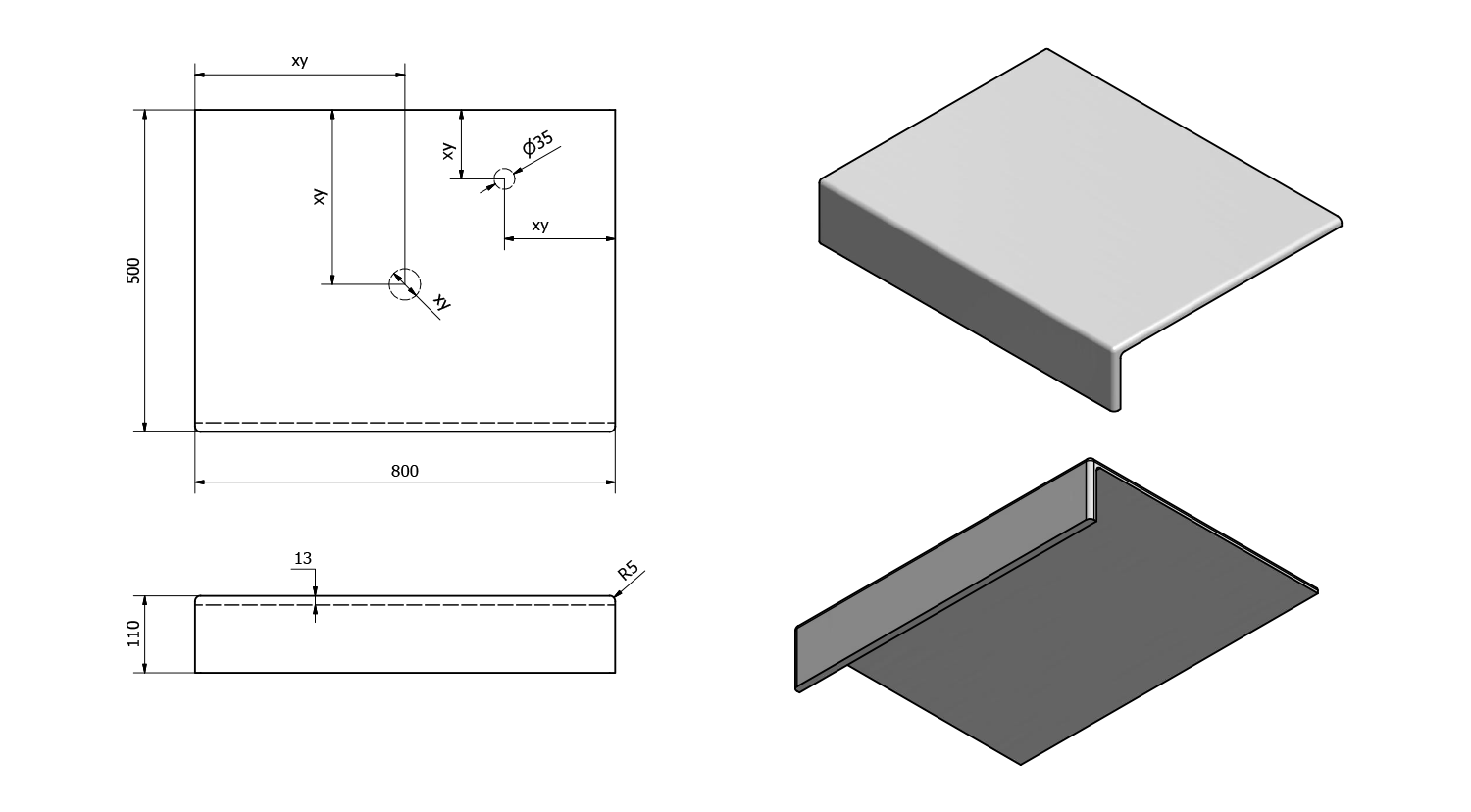 - Možnost dodání s otvory pro baterii a odpad dle výkresu (lze vrtat i v místě instalace)