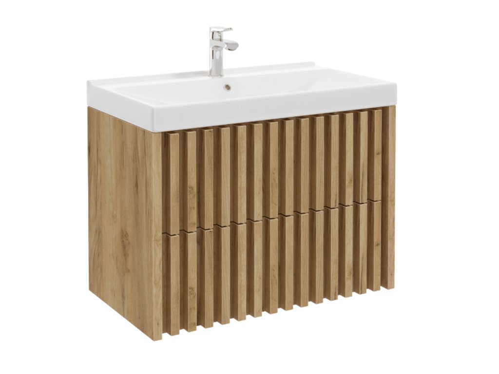 Závěsná koupelnová skříňka s keramickým umyvadlem v dekoru dub s matným povrchem o rozměru 80x46 cm. Povrch v provedení lamino.Dodatočné parametre