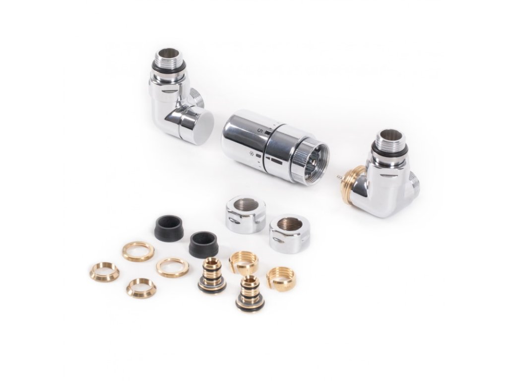 Pravá termostatická úhlová sada obsahuje: termostatický ventil, uzavírací ventil, termostatickou hlavici SLIM, adaptéry AL-PEX ∅ 16x2 a měď ∅ 15. Termostatické ventily s designovou hlavicí Slim slouží k regulaci tekutin v topném systému. Jsou navrženy tak, aby udržovaly konstantní nastavenou teplotu v místnosti a zároveň jsou úsporné vůči energiím. Vlastnosti: Připojovací závit na radiátoru: G 1/2" Připojení na trubky: 24x19 Připojovací závit hlavice: M30x1,5 Použitelné tekutiny: voda, nemrznoucí roztoky Sada obsahuje šroubení na všechny typy trubek, které není třeba dodatečně dokoupit. Spolu s ventilem doporučujeme i zakoupení dekorativní krycí sady, která dokonale schová trubky pro přívod vody. Všechny krycí sady si můžete prohlédnout v příslušenství pro designové ventily.Doplňkové parametry