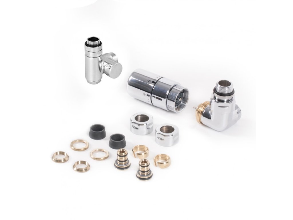 Pravá termostatická úhlová sada obsahuje: termostatický ventil, uzavírací ventil, termostatickou hlavici SLIM, adaptéry AL-PEX ∅ 16x2 a měď ∅ 15. Termostatické ventily s designovou hlavicí Slim slouží k regulaci tekutin v topném systému. Jsou navrženy tak, aby udržovaly konstantní nastavenou teplotu v místnosti a zároveň jsou úsporné vůči energiím. Vlastnosti: Připojovací závit na radiátoru: G 1/2" Připojení na trubky: 24x19 Připojovací závit hlavice: M30x1,5 Použitelné tekutiny: voda, nemrznoucí roztoky Sada obsahuje šroubení na všechny typy trubek, které není třeba dodatečně dokoupit. Spolu s ventilem doporučujeme i zakoupení dekorativní krycí sady, která dokonale schová trubky pro přívod vody. Všechny krycí sady si můžete prohlédnout v příslušenství pro designové ventily.Doplňkové parametry